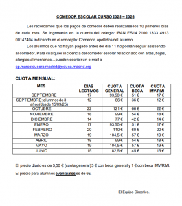 Se puede solicitar reducción del precio del menú escolar a la Comunidad de Madrid cumplimentando la solicitud de beca y entregándola en el Colegio en los plazos establecidos.
