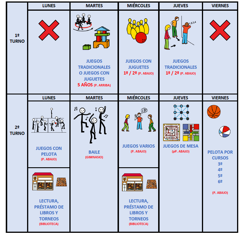 Para que todos nuestros alumnos jueguen en el patio con sus compañeros, en el CEIP Marcelo Usera hemos elaborado un plan de patios semanal. Profesores y Técnicos de Integración Social colaboran para que esto pueda llevarse a cabo.