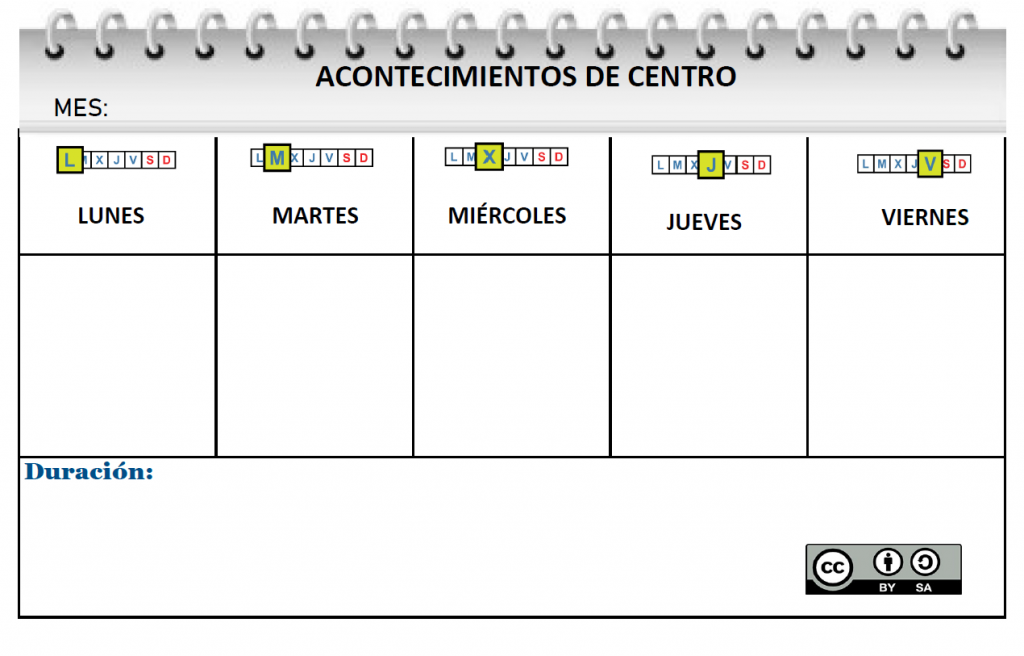 Hemos diseñado este tablero que se pondrá en el hall del Centro, que es una zona común por la que cada mañana pasa todo el alumnado. El objetivo que perseguimos es informar de todos los eventos especiales que tendrán lugar en el colegio a lo largo de una semana.